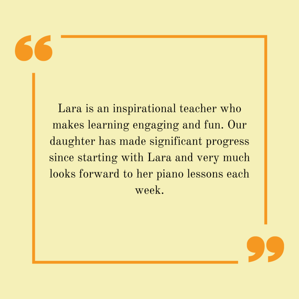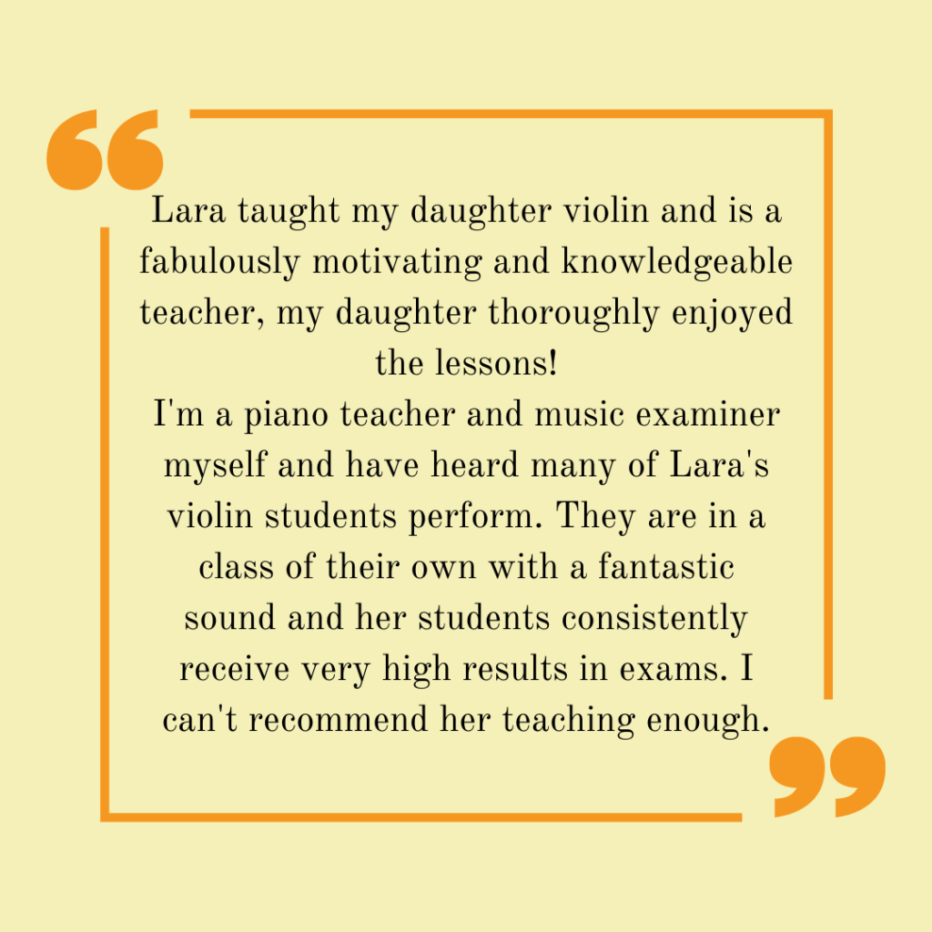 Many of Lara’s pupils have been prize winners at music festivals around the country and a high proportion of her pupils achieve distinction for their ABRSM exams. Pupils have been recognised by the ABRSM for scoring some of the highest marks in the country, and some have gained a place in the National Children’s Orchestra.